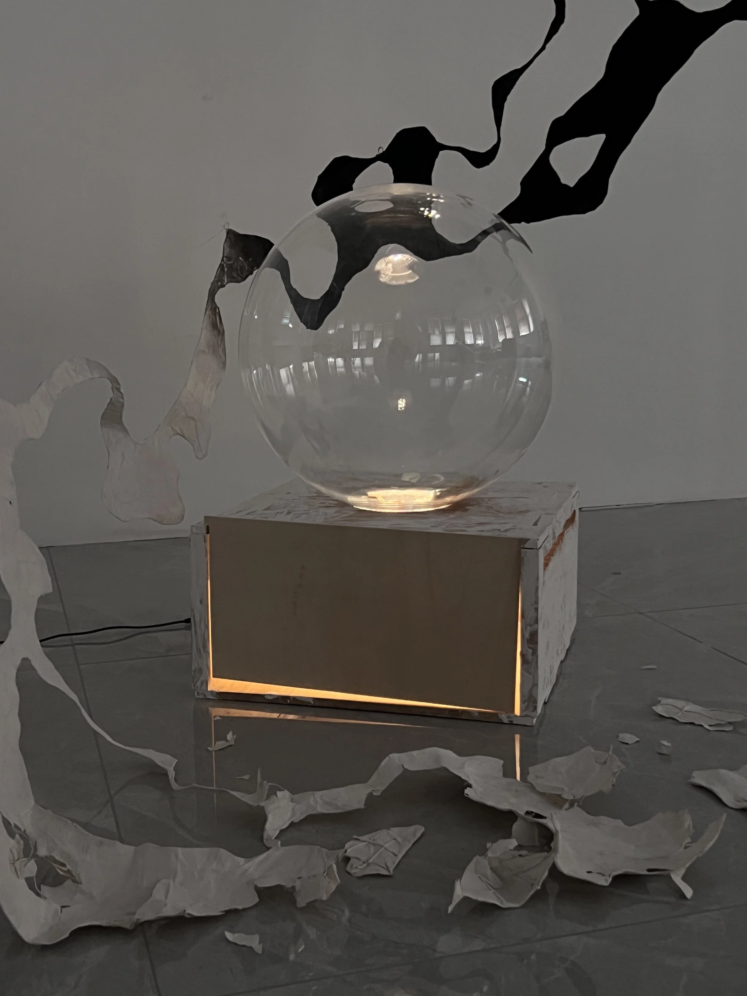 <ASR> is a multimedia installation discovering the psychological and cognitive disruptions caused by external stimuli; using mixed materials: acrylic sphere, wood, colored paper, rice paper, wire, fans, fishing lines, and lighting.