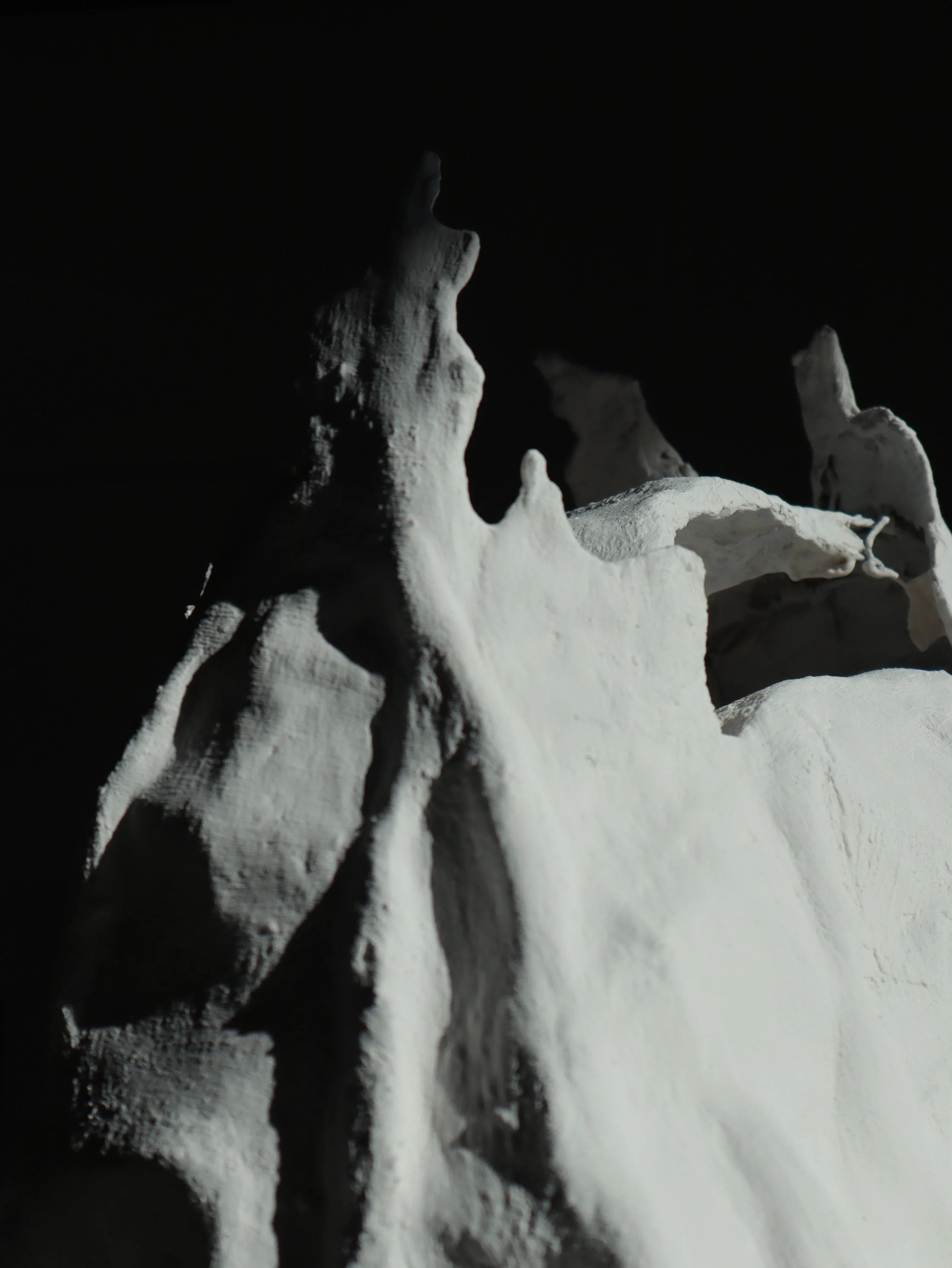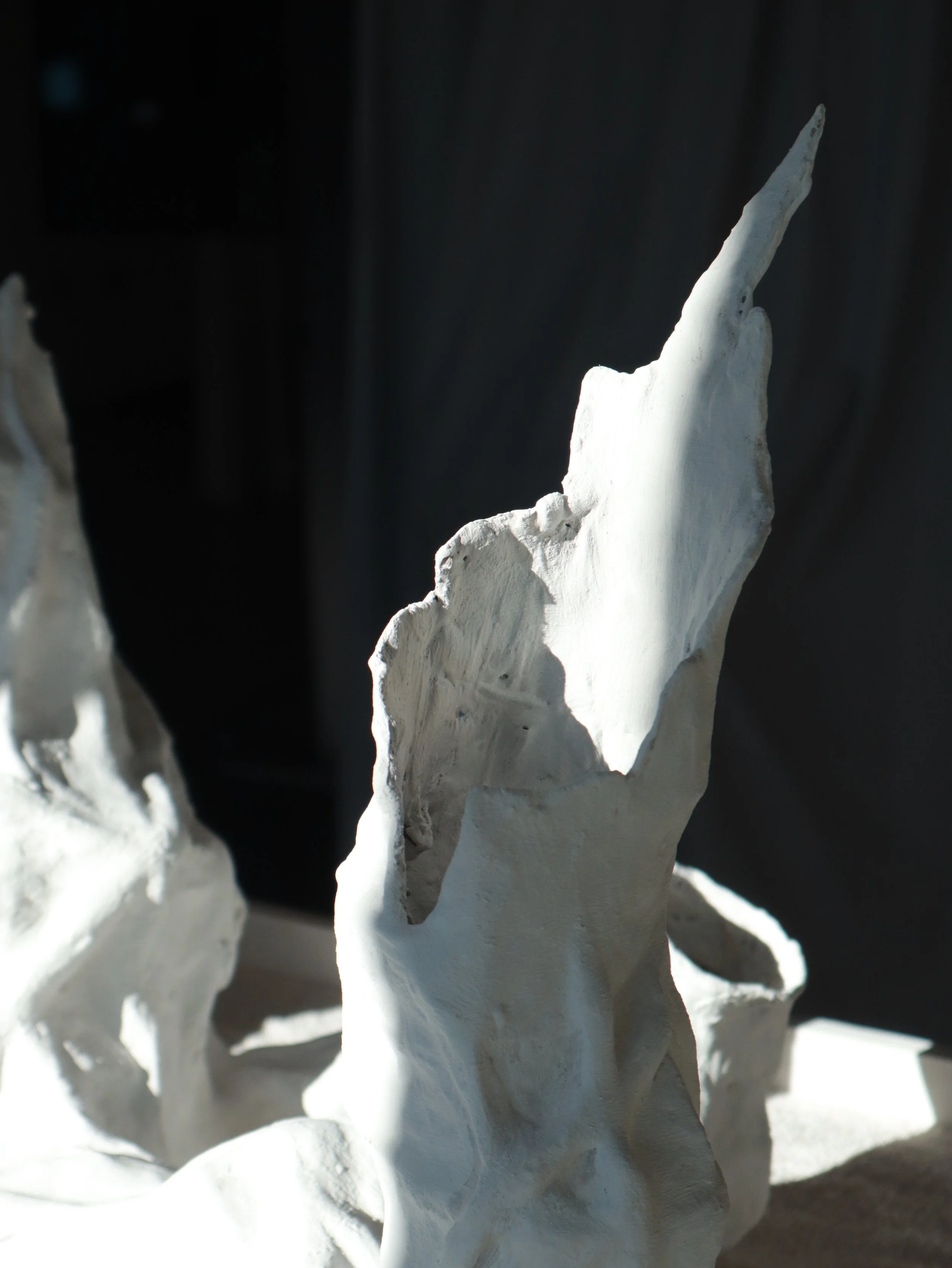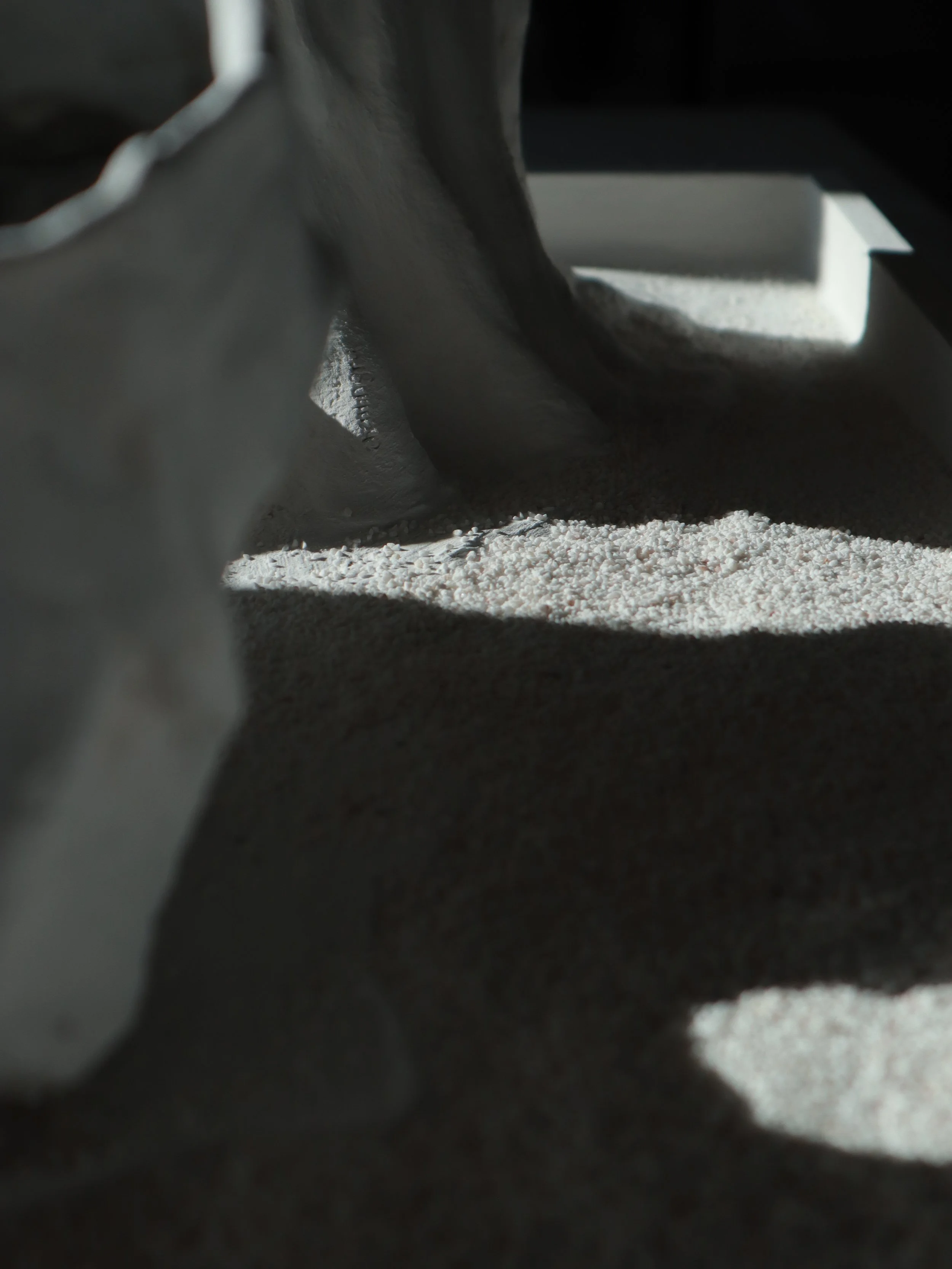 'End of Summer' is an art sculpture focusing on Existentialism; made by wire, clay, filler, marble powder, white paint, resin, wood board and white sand.
