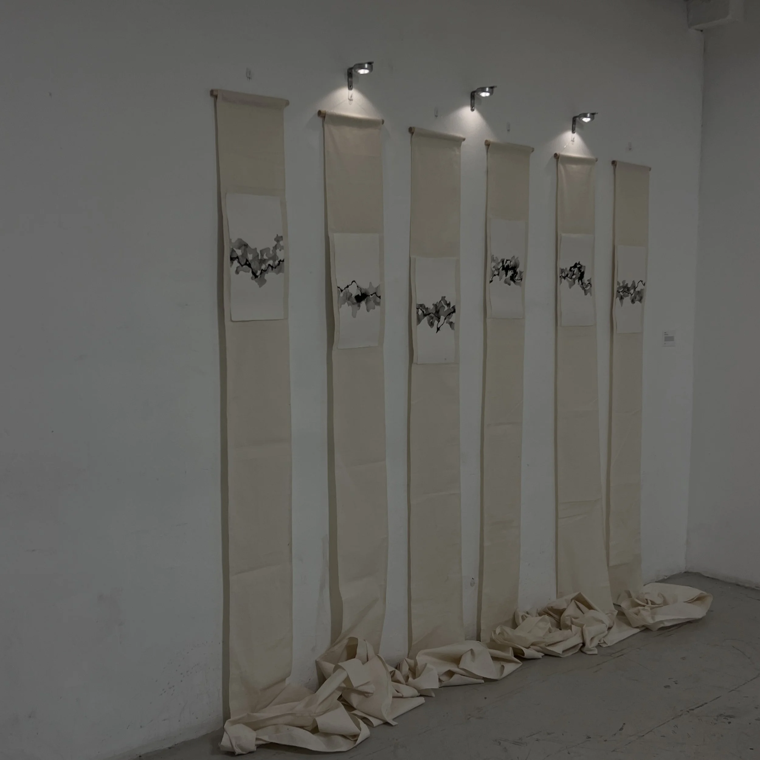 Material: Cloth, Hand-made paper, Acrylic Ink, Water / Dimensions: 1750mm x 2000mm (set of 6)